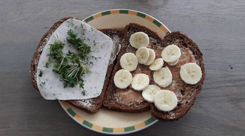 Lekker varieren deze week met je ontbijt!! Volkoren boterham met notenpasta en plakjes banaan / kipfilet met tuinkers