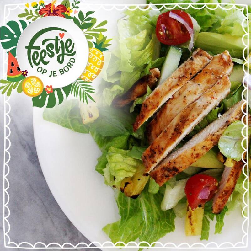 - Doe het geheel in een kom en voeg de komkommer (in stukjes) en ananas (in stukjes) toe. Roer de dressing erdoor en klaar.